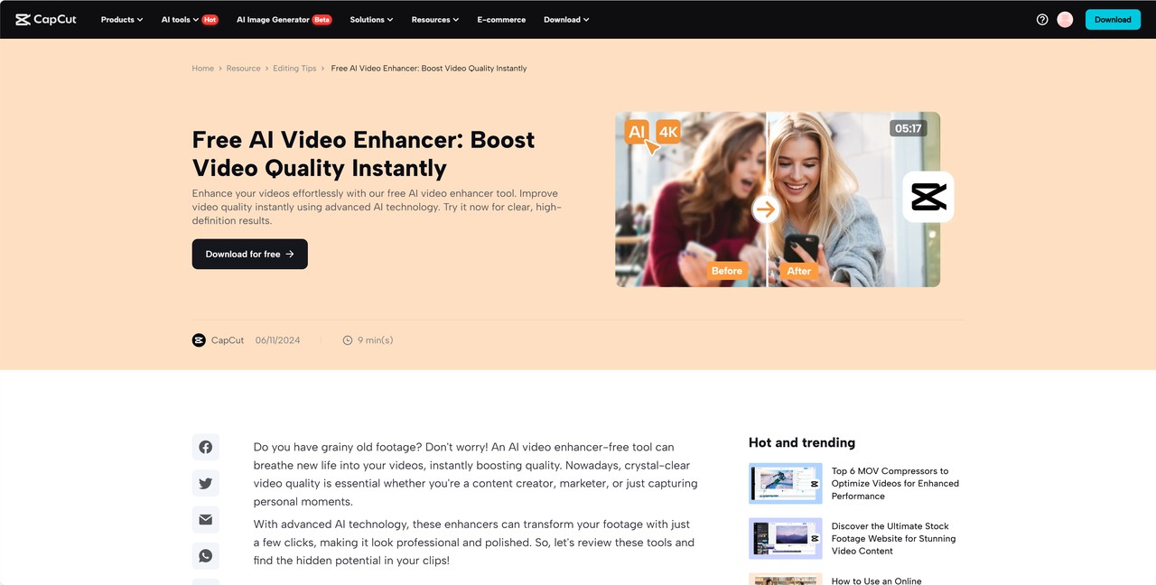 Capcut AI Video Enhancer is an online free tool that use artificial intelligence to upscale videos, inject details and sharpen blur. Although the website shows that this tool can enhance videos to 4K, it only supports enhancing videos up to 2x in tests actually.