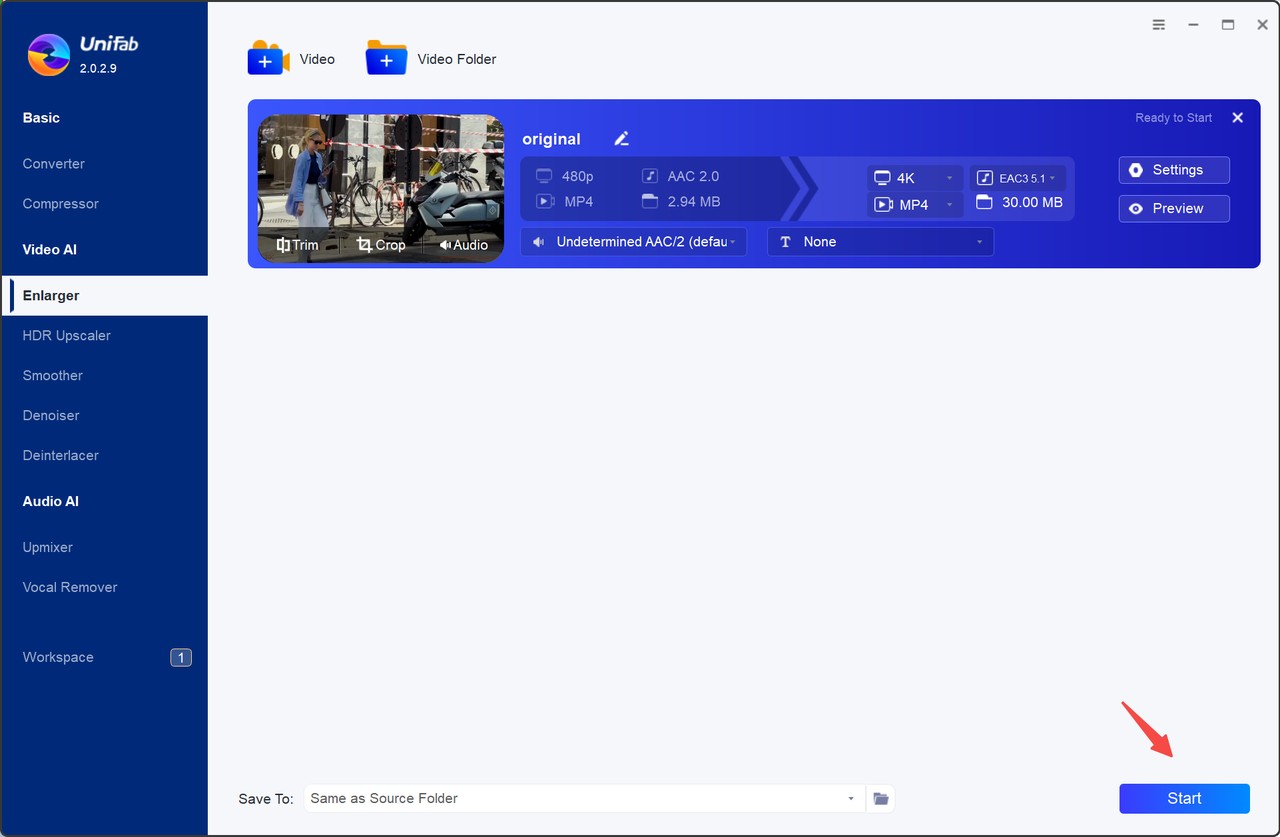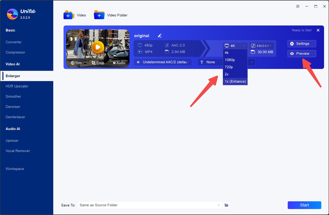 - Video Upscaling: Allows upscale video resolution to 720P, 1080P, and 4K, and enlarges video based on the original resolution to 2x.