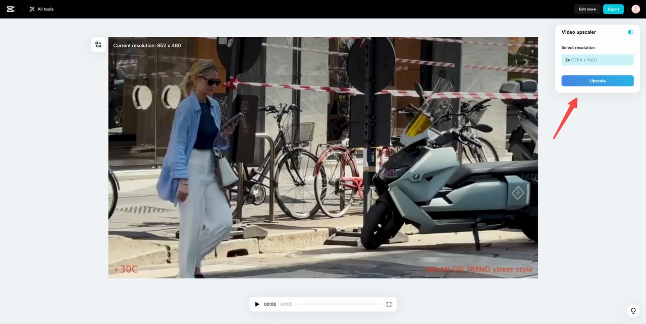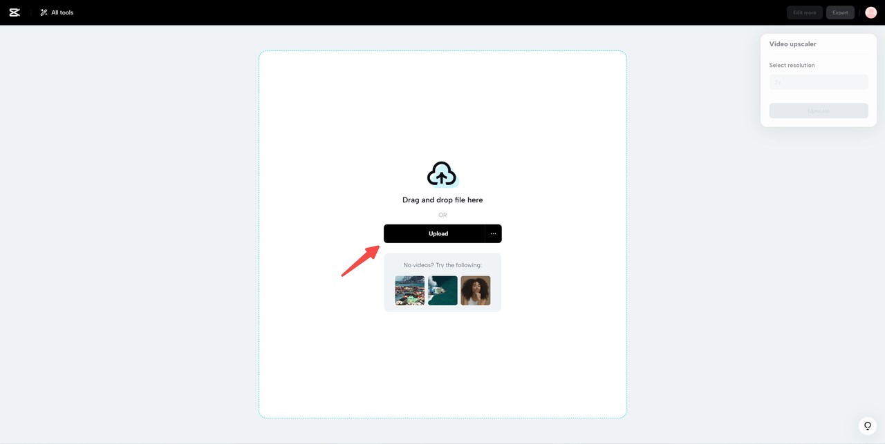 After uploading the videos, you can make the settings and upscale the video. But it will take a while to upscale and it's hard to process successfully. I tried twice and got the results, and the online Capcut AI video upscaler only supports enhancing videos to 2x. It's a terrible user experience.