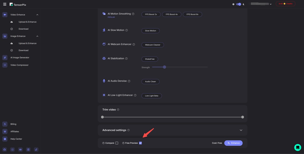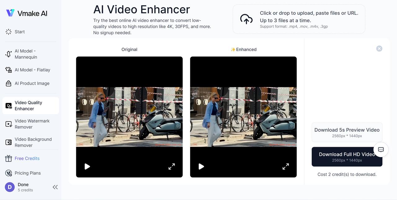 To compare video results, I chose the 4K at last, and you need to click the "Free Preview" button and enhance videos, or you need to pay for credits.