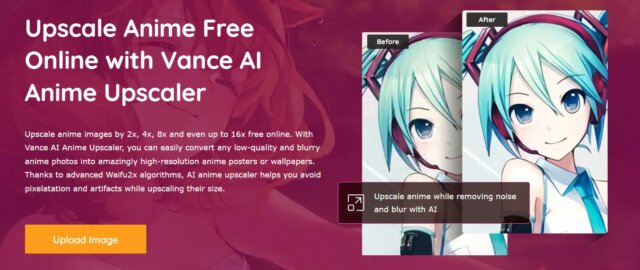 様々なAI補正や高画質化を可能としているVanceAIの中で、二次元画像に強いwaifu2xアルゴリズムを活用し、アニメやイラスト用に特化したサービスです。