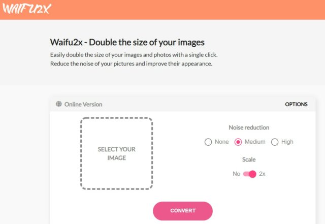 「Waifu2x image resizer」同様、本家waifu2xに近い、シンプルなインターフェイスで画像拡大が行えるサイトです。
