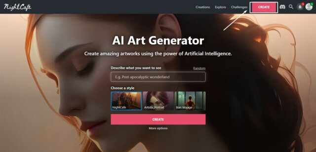 First of all, you would have to open the official webpage of NightCafe AI. Search NightCafe AI on your browser and open the official webpage. If you don't have time and you want to open the page directly, then you can click on this link NightCafe AI. You can scroll down if you want to gain some information about NightCafe AI. If you want to begin the work, then click on create given option on the top right in front of the main page.
