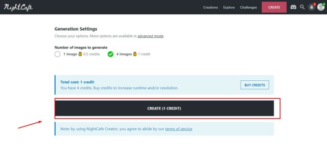 After you have typed your text and chosen a style then, you will have to scroll down to create a unique image. You can also buy more credits if you would like, but when you opened the NightCafe, you will automatically get 5 credits free so that you can have an idea about the performance of the NightCafe creator.