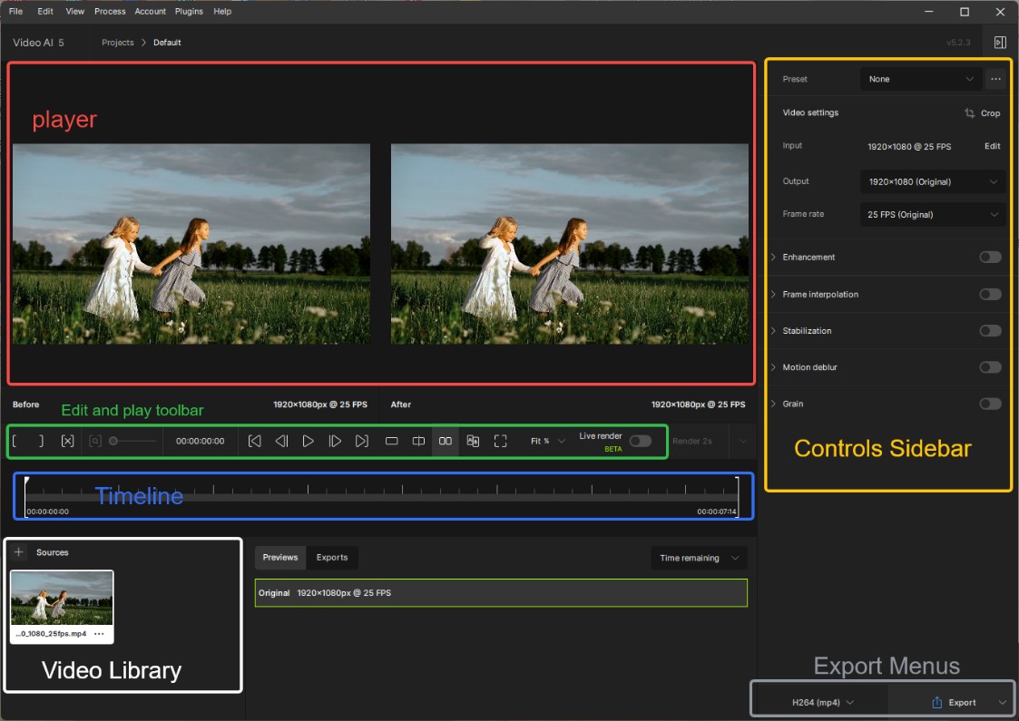 As you can see from the picture, there are many sections on the interface, including video library, player, edit and play toolbar, controls sidebar, timeline, and export menus.